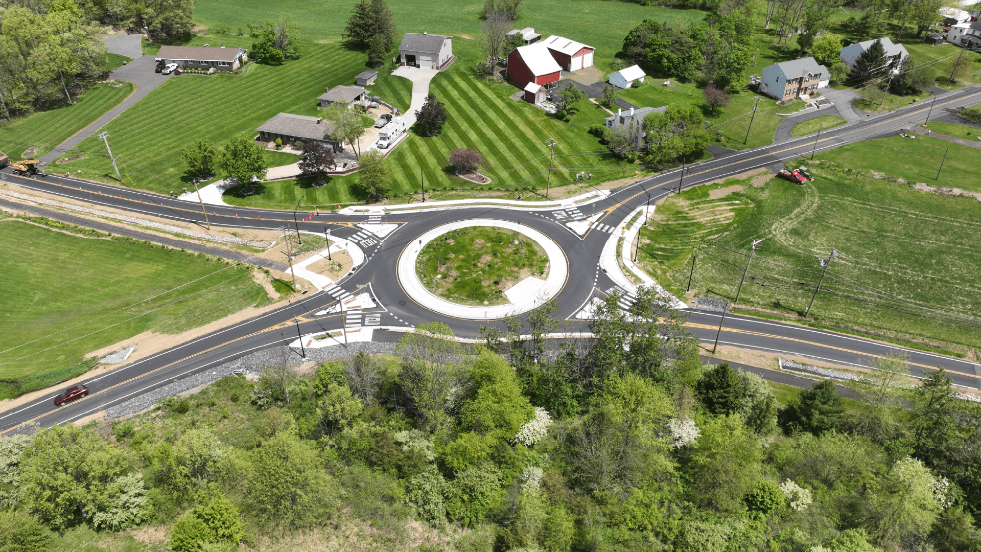 AEG provided comprehensive surveying and geotechnical services for this PennDOT initiative. Under the supervision of a licensed Professional Land Surveyor, AEG conducted all supplemental field surveys, prepared Notice of Intent to Enter letters for affected property owners, and developed a detailed base plan capturing topographic features critical to the design. Geotechnical services included an abbreviated Subsurface Exploration Planning Submission (SEPS), California Bearing Ratio (CBR) borings, and associated lab testing. AEG proposed four borings at each leg of the roundabout and three additional borings near wetlands at the southwest corner. A letter-style Final Geotechnical Engineering Report (FGER) was prepared with recommendations for fill placement near the wetlands. Infiltration investigations were also conducted to assess the impact of water on roundabout stability, and AEG completed the pavement design for the project.